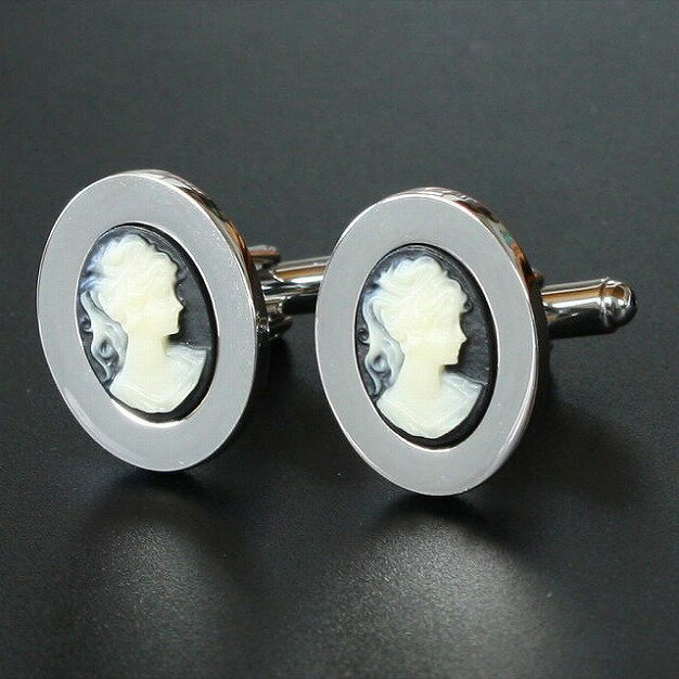 ブラックのカメオを使用したスタイリッシュかつエレガントなカフスボタン。袖口から覗くカメオのカフスボタンに注目が集まりますよ♪自分用としてはもちろん、プレゼントとしても大変喜ばれますよベースカラーーシルバー素材ーbrass(真鍮)サイズー22x16mm 【カフス・カフリンクス】 ※ケースは写真と異なる場合がございます。