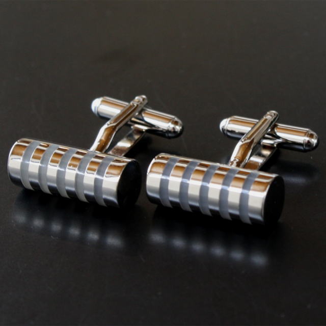 シリンダーシェイプにグレーのラインの入ったカフスボタン。袖口から覗くスタイリッシュなカフスボタンに注目が集まりますよ♪♪自分用としてはもちろん、プレゼントとしても大変喜ばれますよベースカラーーシルバー素材ーbrass(真鍮)サイズー8x21mm【カフス・カフリンクス】 ※ケースは写真と異なる場合がございます。