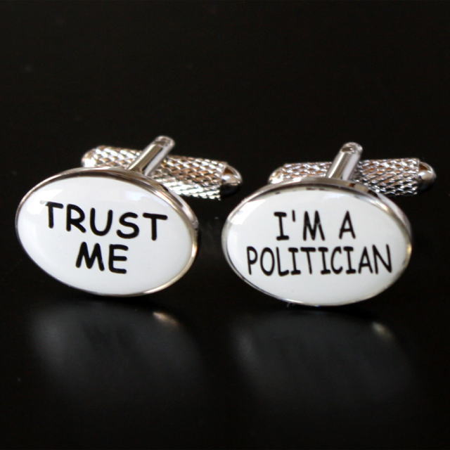 Trust Me, I'm a Politician。 政治家の方にお勧めですね袖口から覗くユニークなカフスボタンに注目が集まりますよ♪自分用としてはもちろん、プレゼントとしても大変喜ばれますよベースカラーーシルバー素材ークロームサイズー12x19mm【カフス・カフリンクス】 ※ケースは写真と異なる場合がございます。