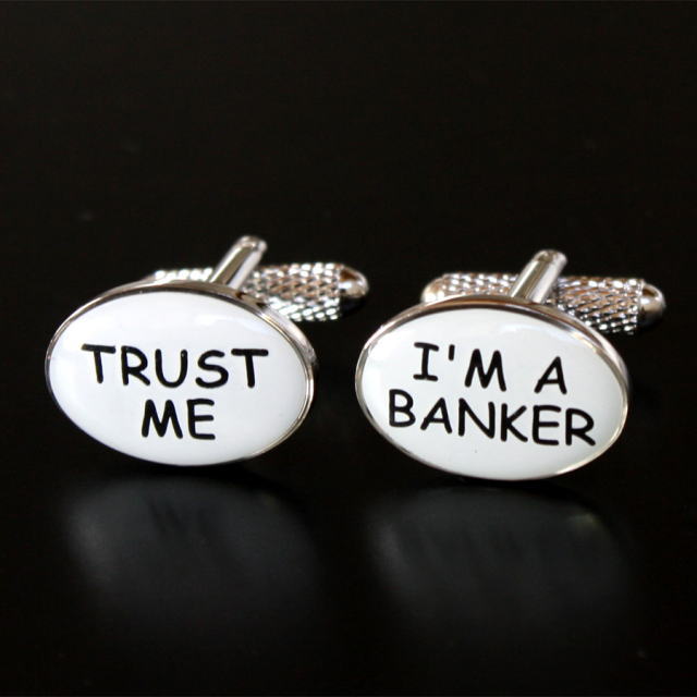 Trust Me, I'm a Banker。 銀行員にお勧めですね袖口から覗くユニークなカフスボタンに注目が集まりますよ♪自分用としてはもちろん、プレゼントとしても大変喜ばれますよベースカラーーシルバー素材ークロームサイズー12x19mm【カフス・カフリンクス】 ※ケースは写真と異なる場合がございます。