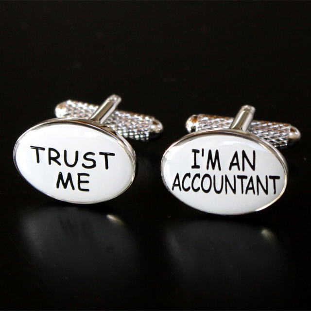 Trust Me, I'm a Accountant。 会計士の方にお勧めですね袖口から覗くユニークなカフスボタンに注目が集まりますよ♪自分用としてはもちろん、プレゼントとしても大変喜ばれますよベースカラーーシルバー素材ークロームサイズー12x19mm【カフス・カフリンクス】 ※ケースは写真と異なる場合がございます。