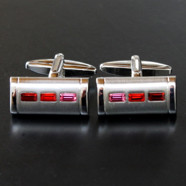 クリスタルを3つ使用したカフスボタン。レッドのグラデーションが袖口を情熱的に演出しますよ♪自分用としてはもちろん、プレゼントとしても大変喜ばれますよベースカラーーシルバー素材ーbrass(真鍮)サイズー10x20mm【カフス・カフリンクス】 ※ケースは写真と異なる場合がございます。